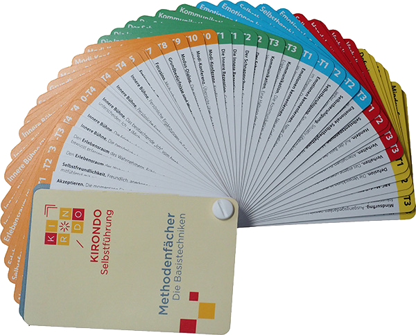 In seiner Grundausstattung enthält das KIRONDO Methodensystem eine repräsentative Auswahl bewährter und selbsthilfegeeigneter Einzelmethoden aus den Bereichen Psychotherapie, Beratung/Coaching, Selbstmanagement und Lebenshilfe.